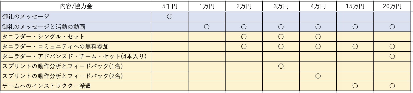 - ④30,000円・・御礼のメッセージ+動画での活動報告+タニラダー・シングルセット+【公式】タニラダー・コミュニティへの参加権+スプリントのフォーム分析フィードバック・1名